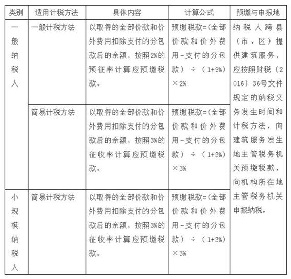 如何理解“跨县(市、区)提供建筑服务”增值税预缴政策? 在实际工作中,很多纳税人因对“跨县(市、区)提供建筑服务”增值税预缴政策理解不到位而导致产生涉税风险。建筑行业增值税预缴政策、税率、计算方法如下。 一、如何理解“跨县(市、区)提供建筑服务”? 所称跨县(市、区)提供建筑服务,是指单位和个体工商户在其机构所在地以外的县(市、区)提供建筑服务。 特别提醒: (1)纳税人在同一直辖市(北京、天津、上海、重庆)、计划单列市范围内跨县(市、区)提供建筑服务的,由直辖市、计划单列市国家税务局决定是否适用国家税务总局公告2016年第17号文件规定。 (2)其他个人跨县(市、区)提供建筑服务,不适用国家税务总局公告2016年第17号文件规定。 (3)纳税人在同一地级行政区(地级行政区,即行政地位与地区相同的行政区,包括地级市、地区、自治州、盟,为二级行政区,由省级行政区(仅限于省、自治区)管辖,中国共计333个地级行政区,包括293个地级市、7个地区、30个自治州、3个盟。)范围内跨县(市、区)提供建筑服务,不适用国家税务总局公告2016年第17号文件规定。 政策依据: 《国家税务总局关于发布<纳税人跨县(市、区)提供建筑服务增值税征收管理暂行办法>的公告》(国家税务总局公告2016年第17号)第二条 《国家税务总局关于进一步明确营改增有关征管问题的公告》(国家税务总局公告2017年第11号)第三条 二、纳税人跨县(市、区)提供建筑服务,税款如何预缴? 根据现行政策规定,纳税人跨县(市、区)提供建筑服务预缴税款如下:
