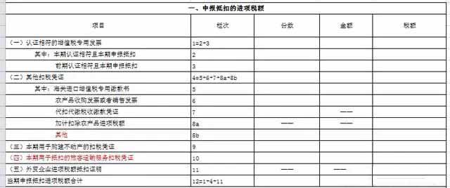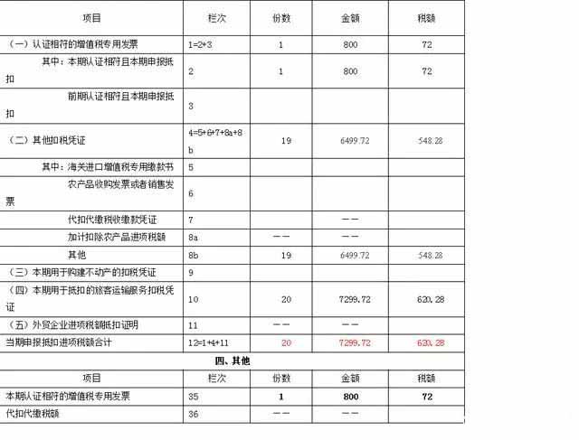 【提示】休假期间外出旅游发生的路费进项税额不得抵扣;市内出租车发票上未注明身份信息,不得抵扣进项税额。 具体填报方法: 第1栏=第2栏,增值税专用发票,份数1,金额800元,税额72元。 第4栏=第8b栏,其他扣税凭证,份数=2+(5-1)+10+3=19(份) 其他扣税凭证金额=200+(5000+800-1000-120)÷(1+9%)+1520÷(1+9%)+630÷(1+3%)=6499.72(元) 税额=18+(5000+800-1000-120)÷(1+9%)×9%+1520÷(1+9%)×9%+630÷(1+3%)×3%=548.28(元)